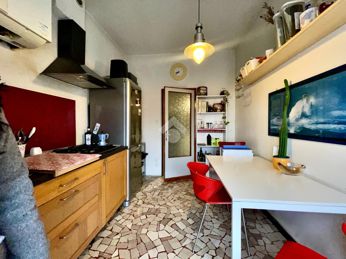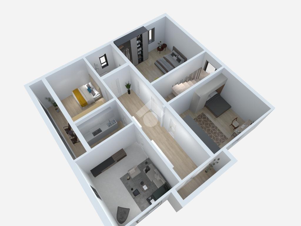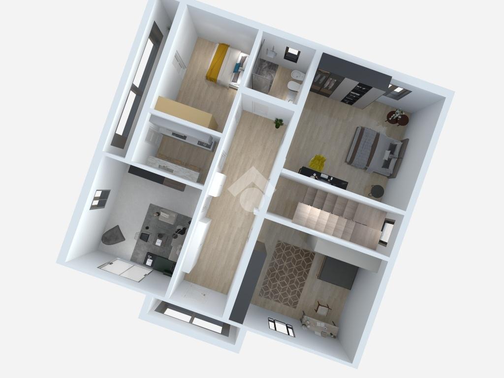Al piano primo, troviamo il terzo appartamento, di metratura più generosa (125 mq. .) attualmente locato a 550,00 euro mensili fino al 2028, offre un luminoso ingresso con soggiorno e cucina separati, tre camere ed un bagno finestrato.