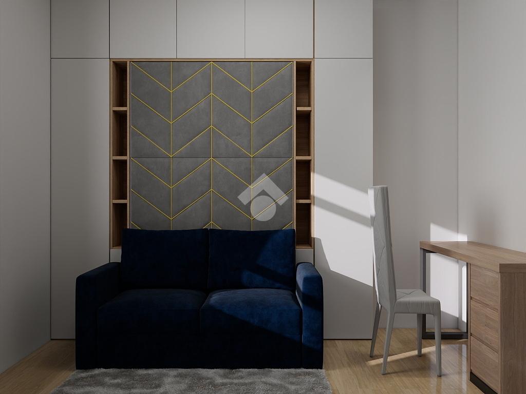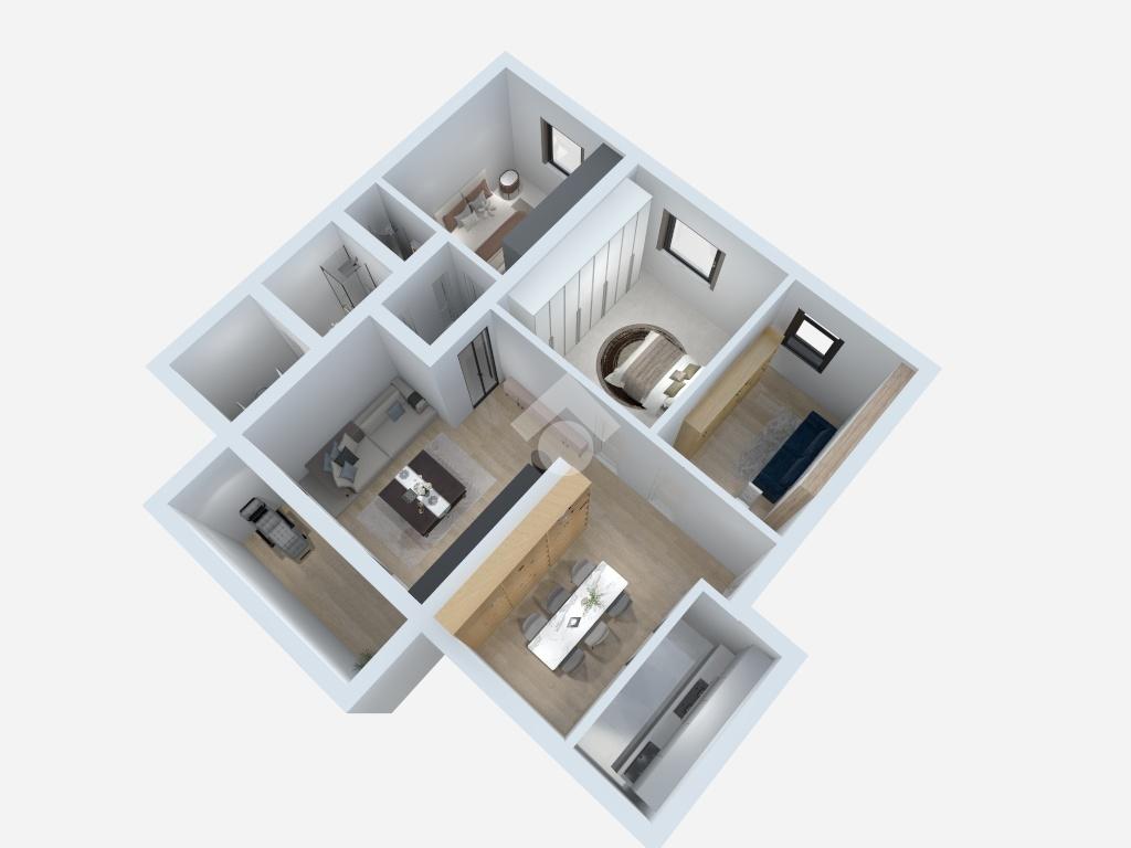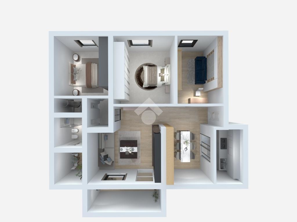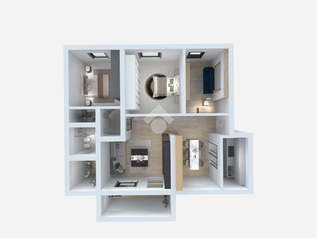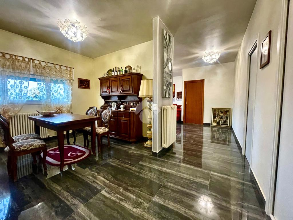 L'ingresso si apre su un ampio e luminoso soggiorno che si affaccia su un terrazzo esposto a sud con vista panoramica.